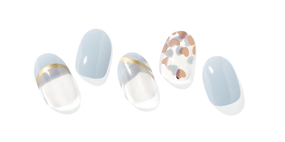 『ohora』ユーザーが参加し、投票によって選ばれたデザイン。洗練されたブルーグレーとゴールドのラインを組み合わせたフレンチに、ハートのスパンコールネイルが、遊び心とかわいらしさを感じさせます。