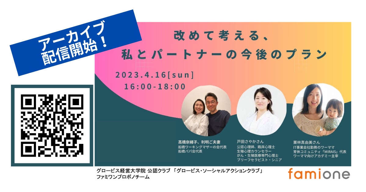 今回、ファミワンのプロボノチームとの共催で、「改めて考える、私とパートナーの今後のプラン」~先輩・専門家に学ぶこれからの人生の課題解決のヒント~ と題し、妊活をはじめとするキャリアプランニングにおけるパートナーとのコミュニケーションをテーマに開催をしたセミナーのアーカイブ配信を開始しました。