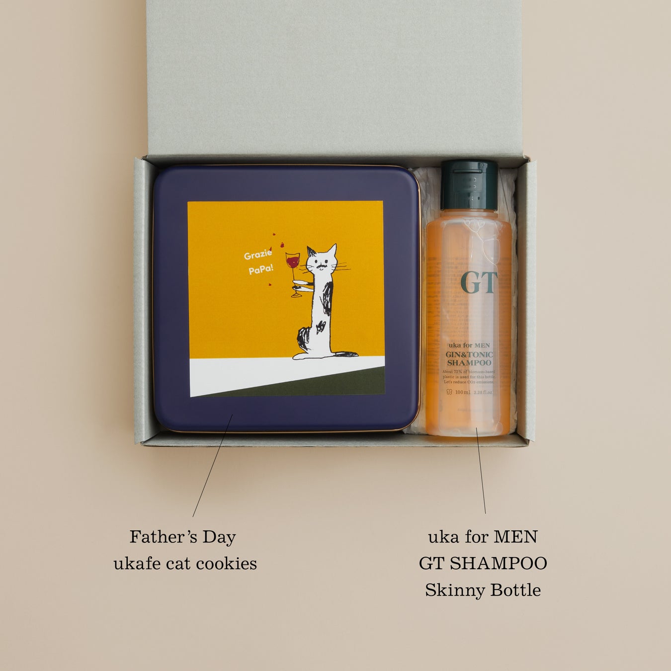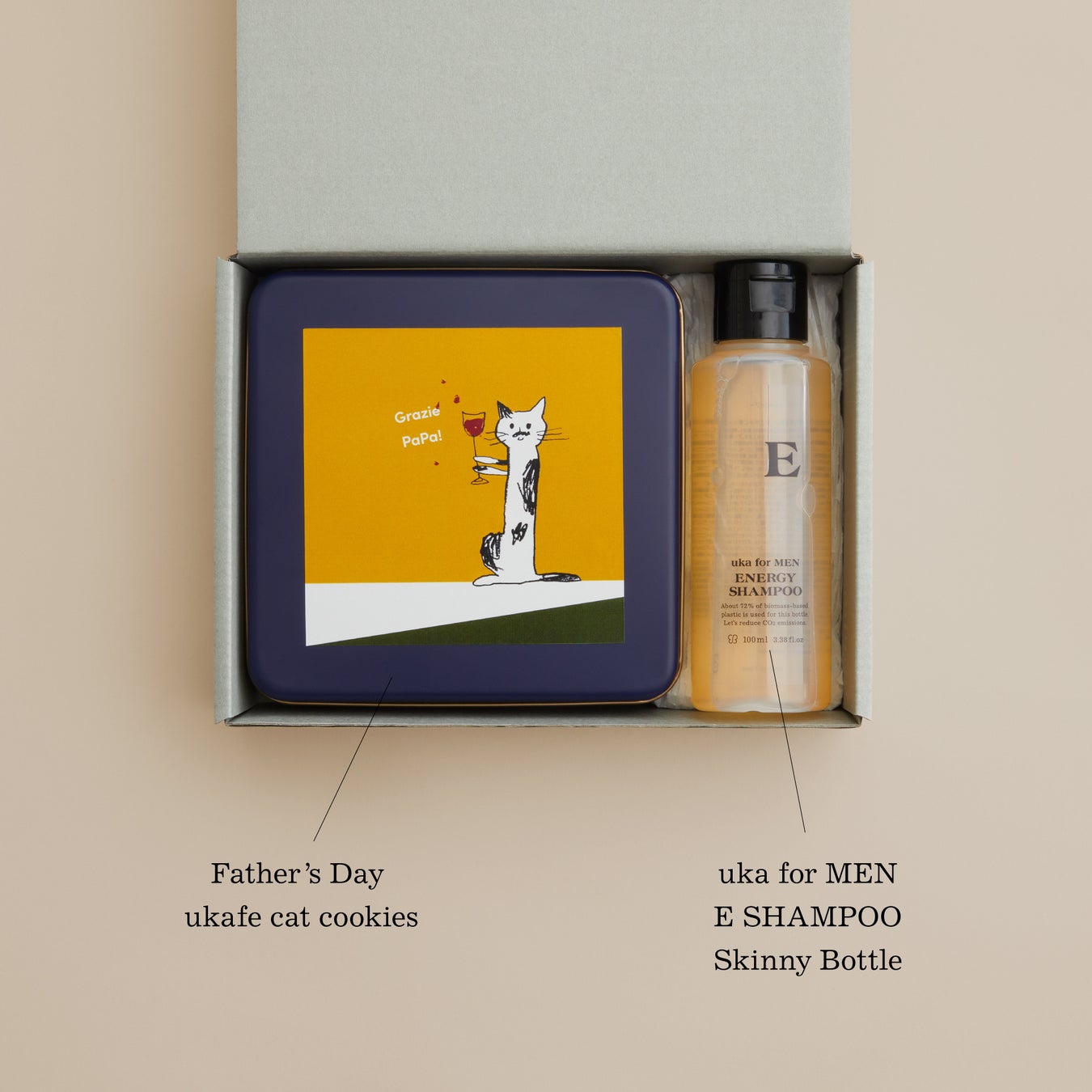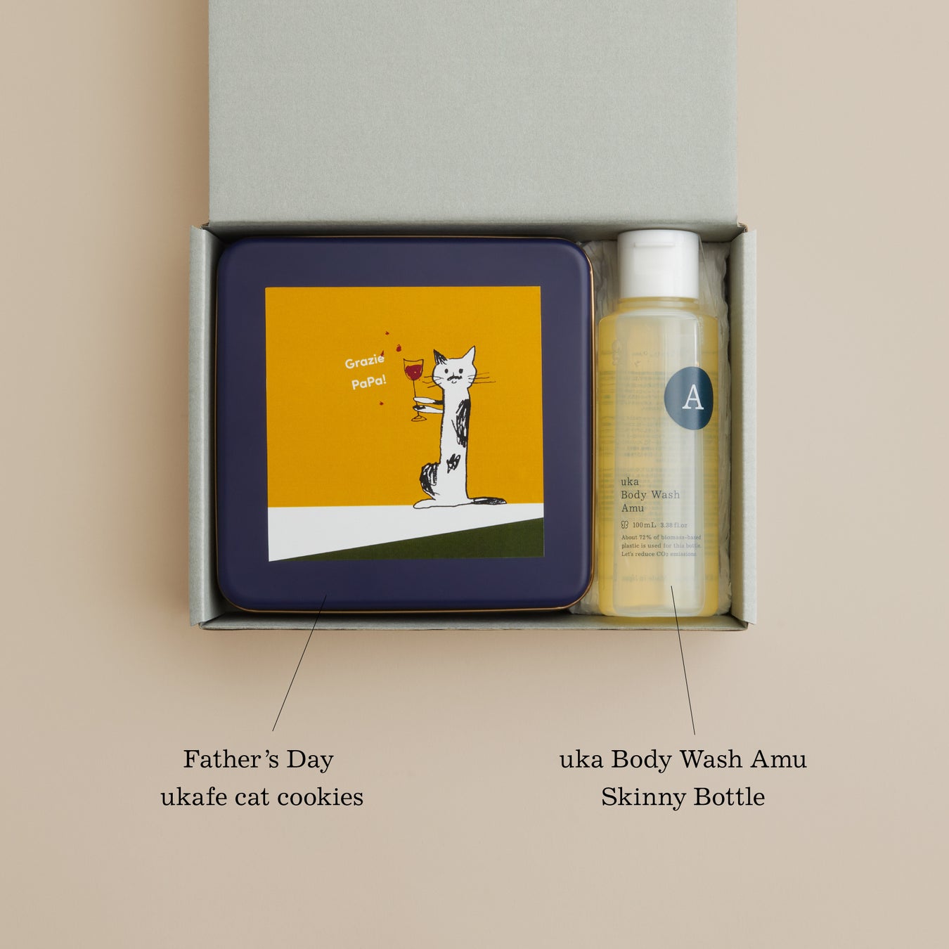 父の日限定三毛猫クッキーとこだわりの精油を贅沢にブレンドしたuka Body Wash Amu Skinny Bottleをセットに。