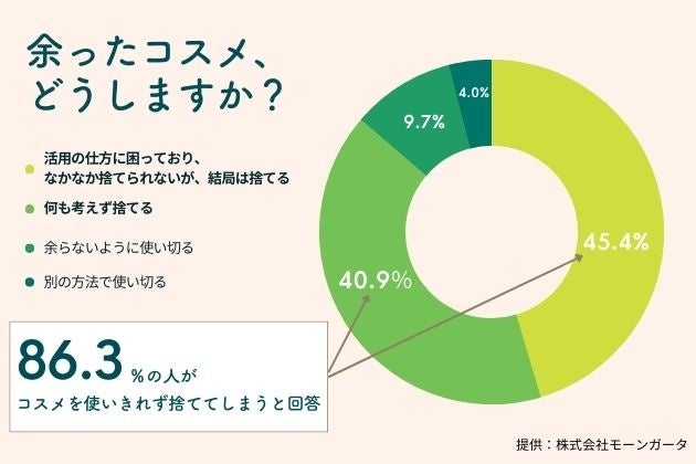 私は以前、化粧品会社で研究開発に携わっており、ユーザーがコスメを使い切れずに捨ててしまっている状況を目の当たりにしてきました。実際、弊社で調査したところ、86.3%のユーザーが使い切れないコスメを廃棄していて、そのうちの45.4%の方は捨てることに罪悪感があり、使用期限を迎えるまで廃棄できない、という実態が浮かび上がりました。