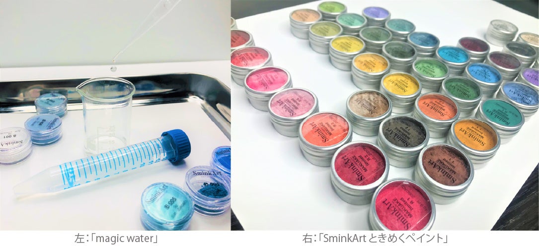 これを解決するには、コスメを購入する際に「本当に自分に似合う色みか」「トレンドに左右される必要があるのか」といったことを改めて考えるとともに、コスメの枠にとらわれず、違ったモノにアップサイクルするという、発想の転換も必要だと感じます。たとえば弊社では、撥水加工されている粉末状コスメ(アイシャドウ・チーク・ファンデーション)を水に溶ける色材へ変える特殊な液体『マジックウォーター』を開発。ユーザーが使い切れなかったコスメをご家庭で絵の具に変え、絵を描いたりDIYを楽しんだりできる“SminkArt(スミンクアート)”をご提供しています。