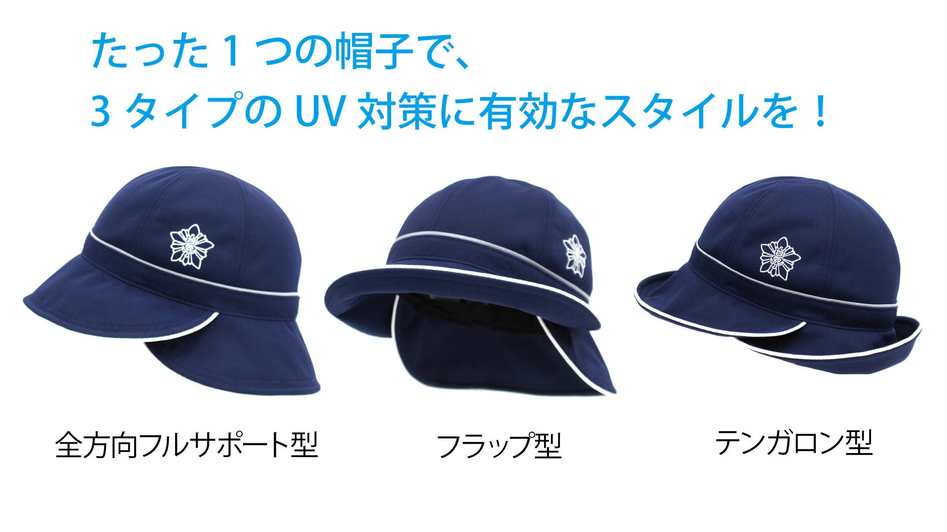 紫外線対策に有効な3つのスタイル(エポカルオリジナルデザイン)を1つの帽子で。