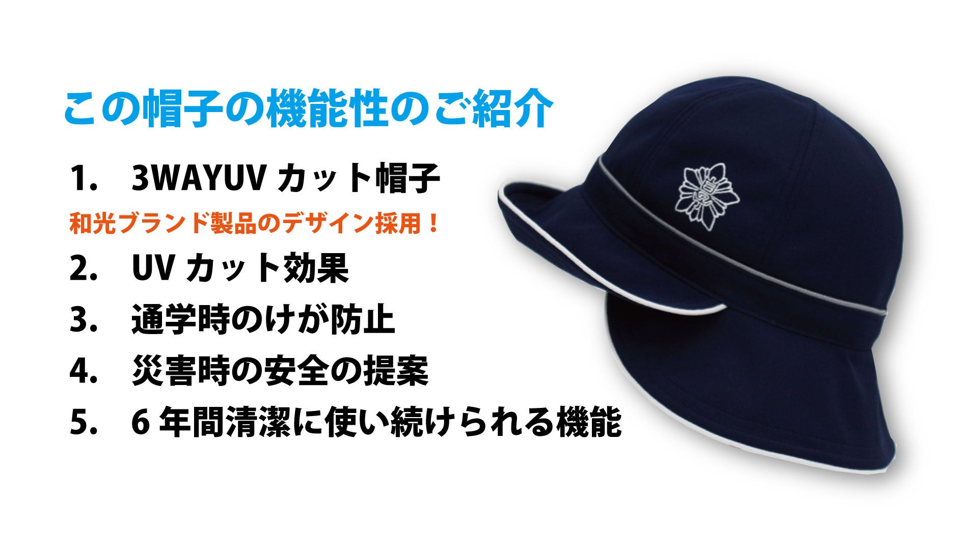 この帽子を全国に広め、登下校時の児童の肌・目の健康を有害紫外線から守り、さらに、怪我を少しでも軽減できるように、この3WAYUVカット制帽を広げて行きたいと考えています。