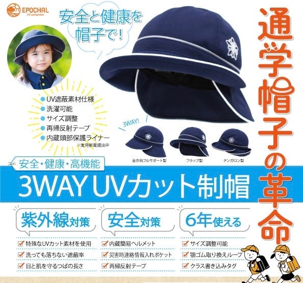 株式会社ピーカブー(本社:埼玉県和光市、代表取締役:松成紀公子)は、通学時の児童の肌の健康を守り、災害対策やけが防止も出来る「エポカルUVカット3WAY制帽」を販売開始!
