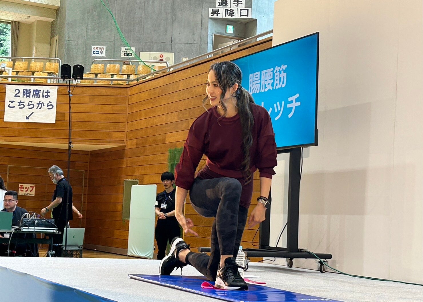 岡部よりトークセッションでもお話しさせていただいたように、「運動で成長ホルモンの分泌を促す」ために適度な筋トレと休息を取ることが大切とし、「体調改善のキーワードは”お尻”」をテーマに岡部による初心者・老若男女でも可能なヒップフィットネスを指導させていただきました。