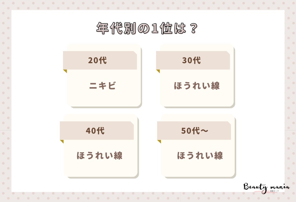 ・マスクで隠れていたのに、マスクを外すと見えてしまう箇所なので気になります。また、歳をとったせいか表情筋が衰えたのか、ほうれい線が濃くなっていると感じるのでとても気になります。(40代)