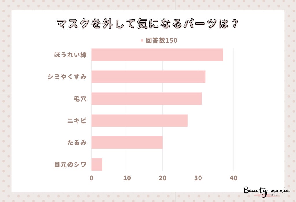 「マスクを外すようになってから気になるお顔の悩みはなんですか?」とアンケート調査した結果、1位は『ほうれい線(37人)』でした。次ぐ2位は『シミやくすみ(32人)』、3位は『毛穴(31人)』となっています。