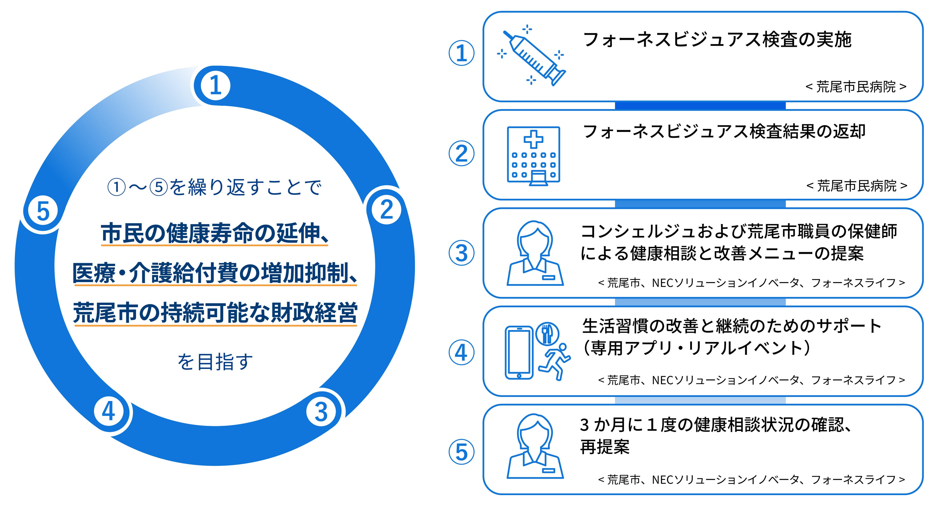 荒尾市が目指す、市民の健康寿命の延伸、医療・介護給付費の増加抑制、荒尾市の持続可能な財政経営の実現に向け、2023年3月より、フォーネスライフおよびNECソリューションイノベータとともに、官民連携の「スマートシティプロジェクト」に取り組んでいます。その一環として、「フォーネスビジュアス検査」の次のステップである、検査結果に基づいた一人ひとりに合った生活習慣改善プログラムの提供、継続のためのフォローを開始します。