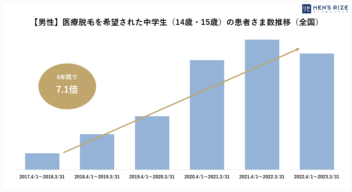 実際に【当院へ来院された中学生男女(医療脱毛希望の14歳・15歳の中学生患者数)】を6年前と今期を比較(※)すると、【リゼクリニック(女性)では、「3.4倍増」】【メンズリゼ(男性)では、「7.1倍増」】へ変化するなど、6年前と比べると美容意識の低年齢化が伺えます。
