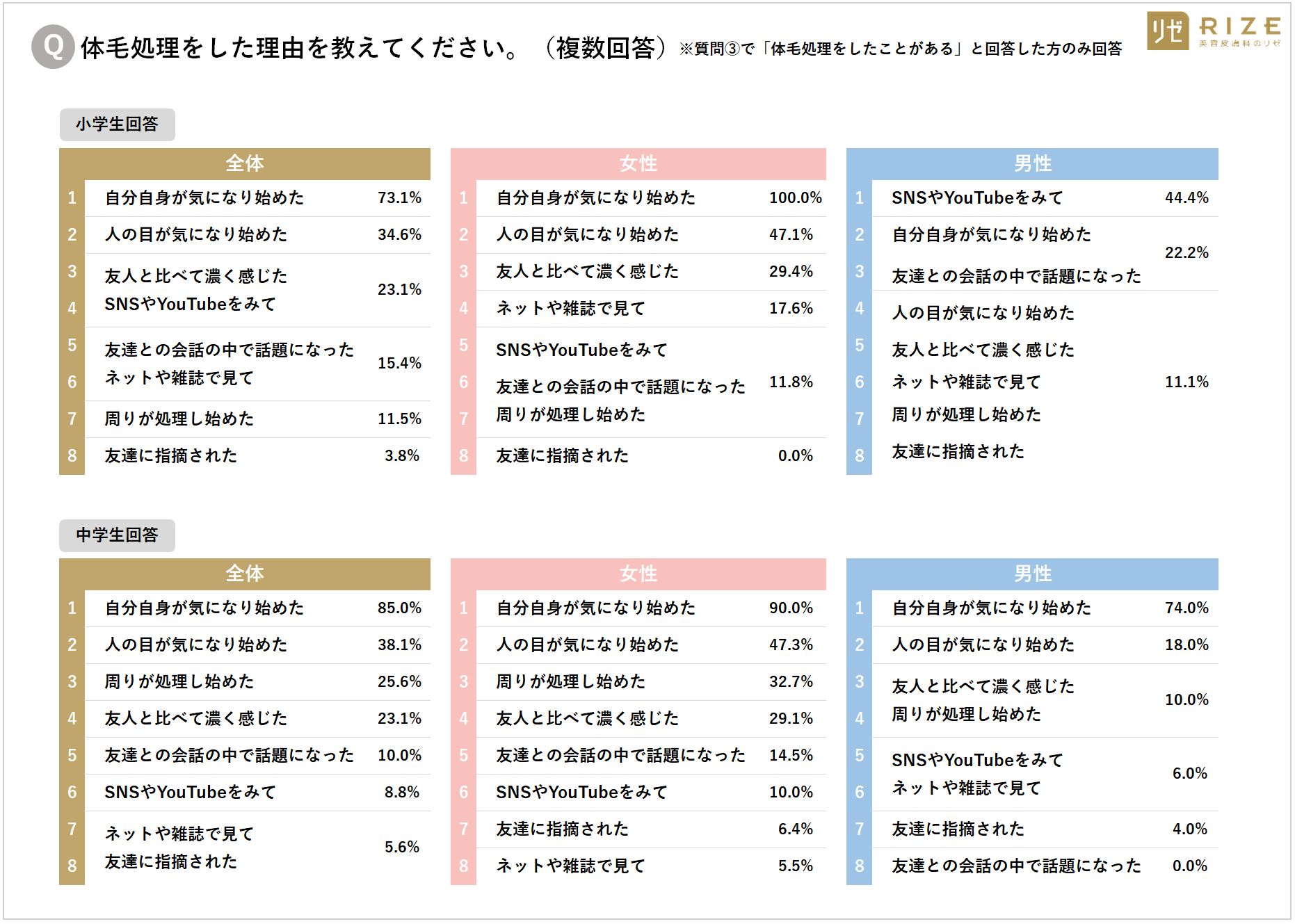 ④【体毛処理をする理由は?】女性:小中学生ともに「自分自身が気になり始めた」が1位回答に
