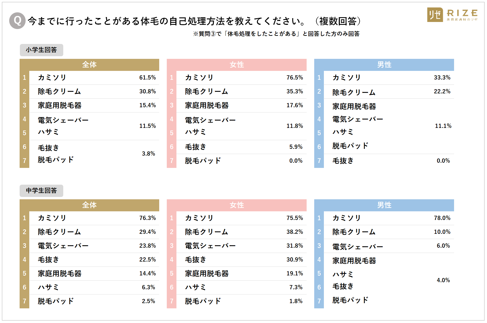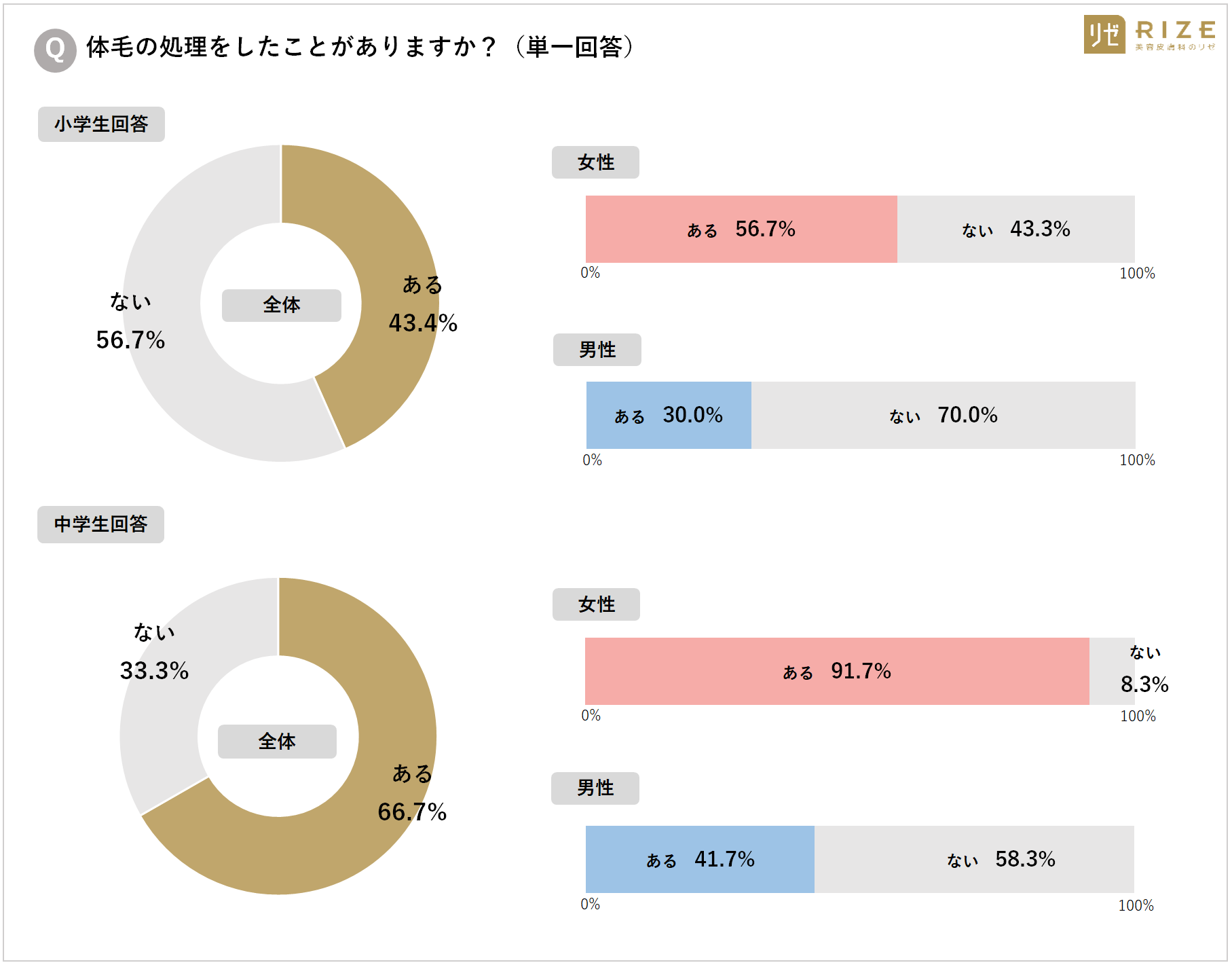 「体毛処理の経験があるか」の問いには、小学生の4割、中学生の7割が「体毛処理したことがある」と回答。