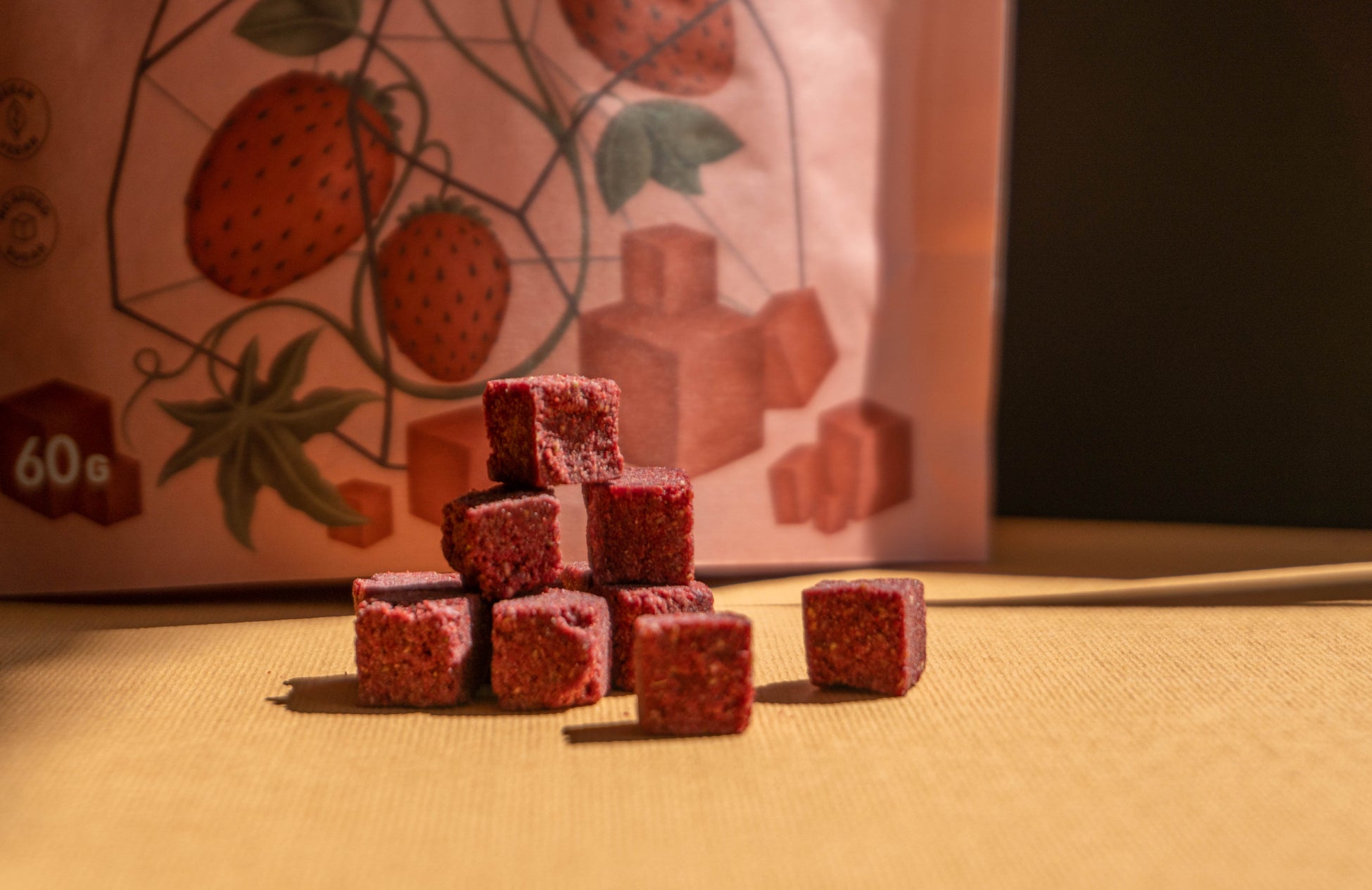 1パックに400〜500gの新鮮なフルーツをフリーズドライによって60gまで凝縮し、フルーツの濃い味わいと豊富なビタミン類、ココアバターに含まれる飽和脂肪酸で甘みと口の中でとろける様な味わい、スーパフードのヘンプをCBDアイソレートで配合することでCBDの摂取と他の素材の味を強調し、貴重な水溶性食物繊維イヌリンを配合し腸内環境へアプローチ、食材本来の味わいとキャリアオイルを使用しないで体内へアプローチを行い、人工甘味料を使用せず、自然由来の食材で生み出された,”健康的なお菓子”を追求した新感覚CBD製品。