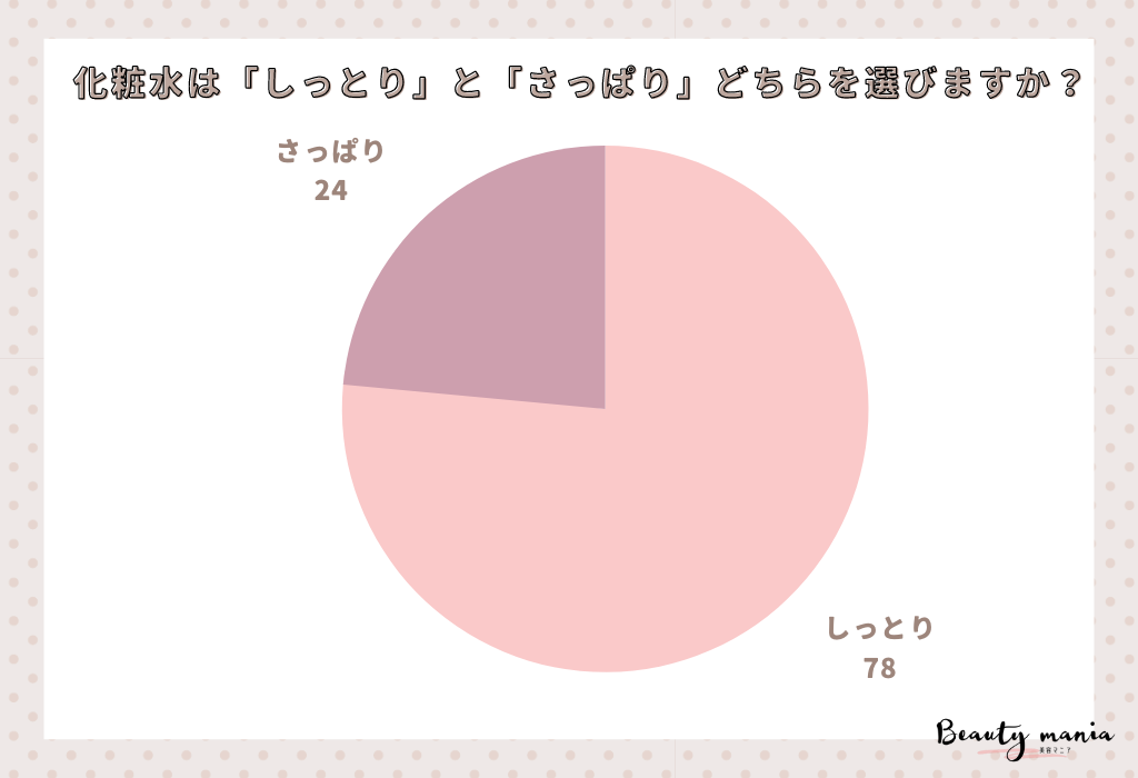 「化粧水は「しっとり」と「さっぱり」どちらを選びますか?」とアンケート調査した結果、1位は『しっとり(78人)』2位は『さっぱり(24人)』でした。