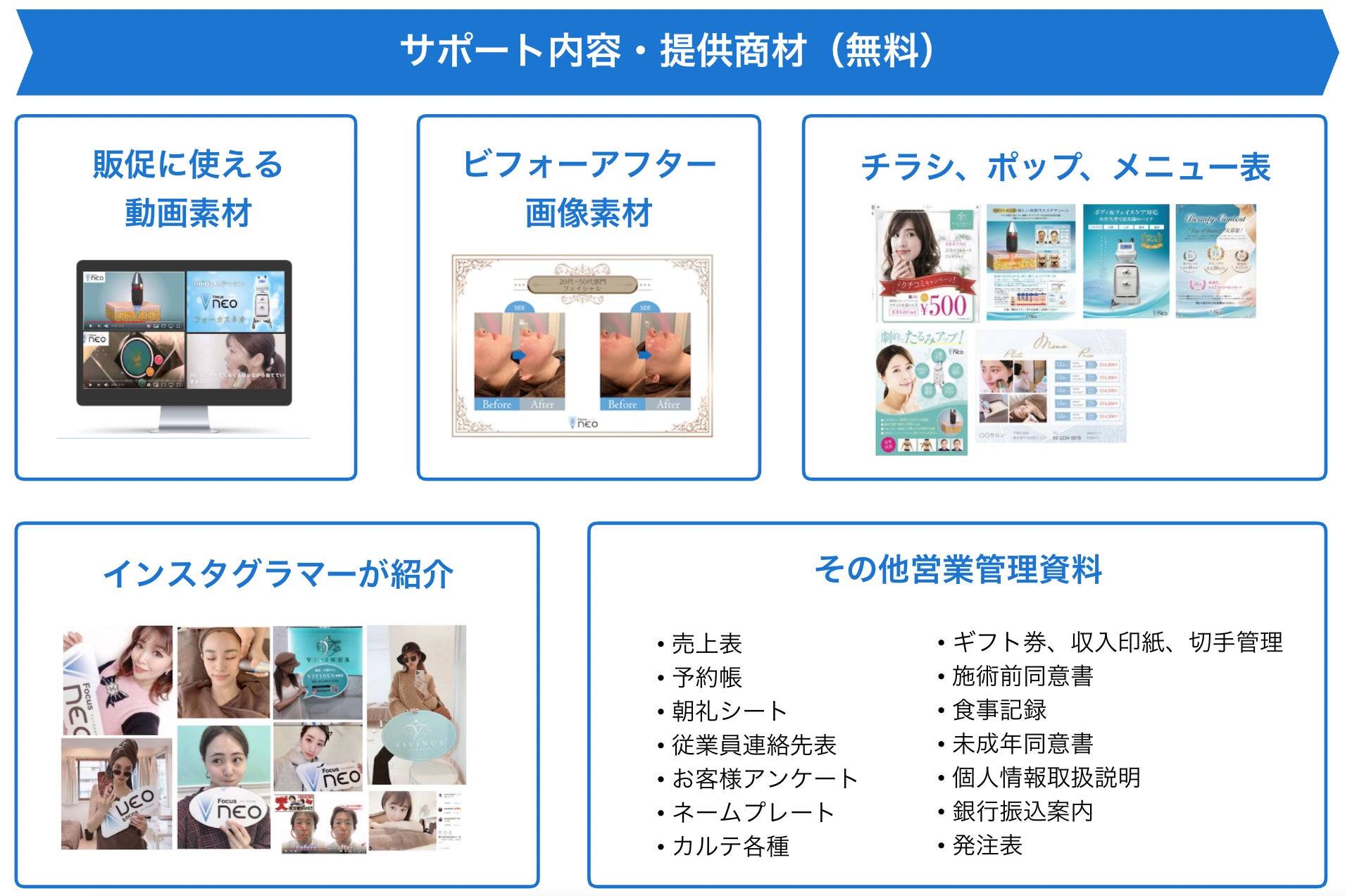 販売メーカーのDr.Viseaが提供するサポート内容は、融資や補助金などの開業支援やSNS集客方法のレクチャー、GoogleSEOサポート、ホットペッパービューティー集客の無料講習会、販促資材の提供など、サロン運営を全面的にバックアップするサポートがあります。さらに、ドクター相談サポート(※1)があり、「エステ保険」「PL保険」(※2)にも加入できるため安心して導入することができます。