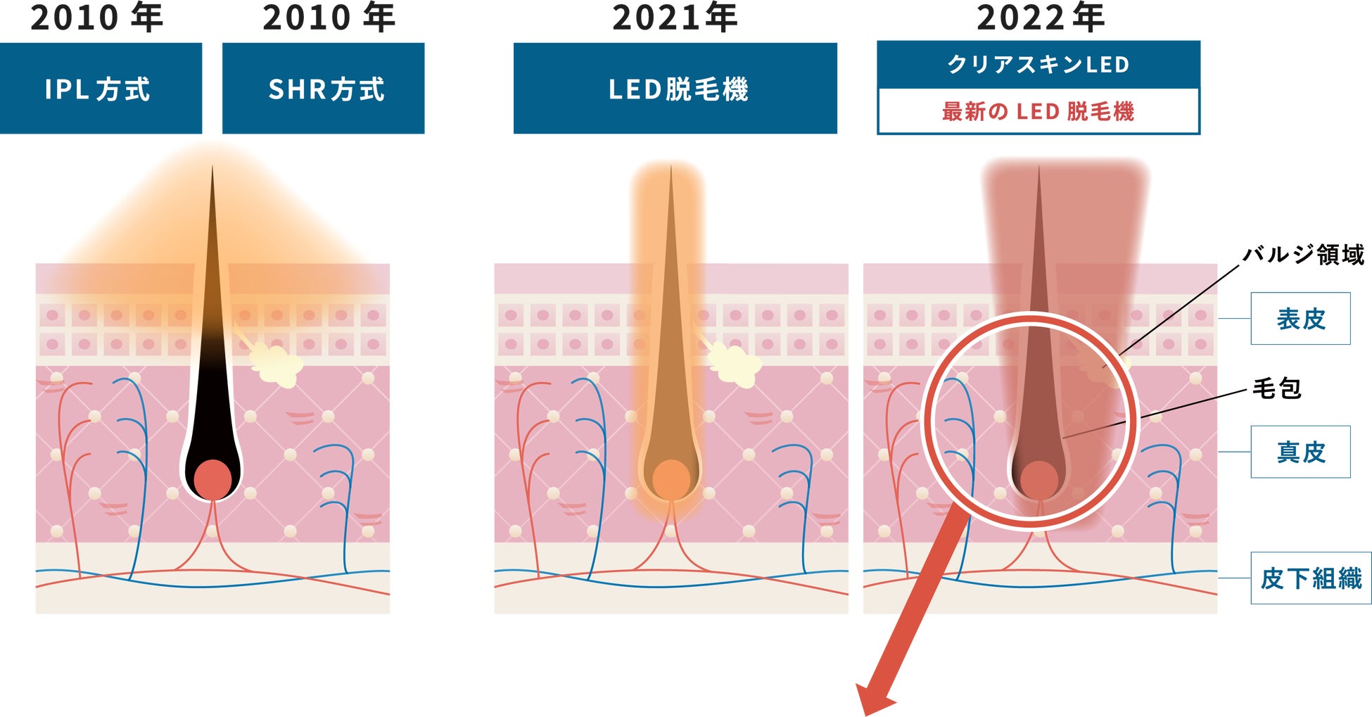 冷却効果が高く痛みが少ない。さらに、バルジ領域と毛包へ同時にアプローチすることで高い脱毛効果を実現した。