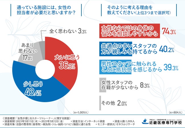「そのように考える理由を教えてください(複数回答可)」と質問したところ、『女性ならではの身体の悩みを相談しやすいから(74.3%)』と回答した方が最も多く、次いで『共通点の多いスタッフの方が親しみを持てるから(40.2%)』『男性スタッフに触られることに抵抗感を感じるから(39.3%)』『女性スタッフの在籍が少ないから(8.3%)』と続きました。