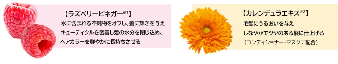 毛髪にうるおいを与えるカレンデュラエキス※2も配合(コンディショナー・マスク)、シルクのようになめらかで光り輝く髪へ導きます。ジューシーなラズベリーの香り。