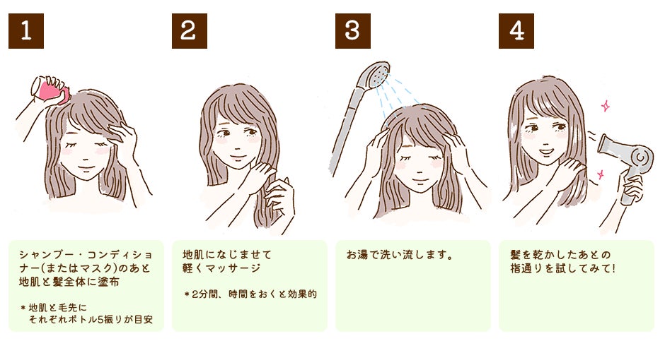 シャンプー、コンディショナー、トリートメントの後に使用することで地肌のキメを整え、髪にハリ、コシを与えます。