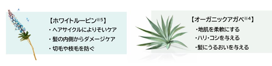 ヘアサイクルによりそうケアで、切毛や枝毛を防ぐホワイトルーピン※5と、地肌を柔軟にし、髪にハリ・コシを与えるオーガニックアガベ※4を配合。