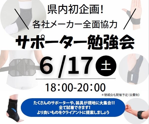 今回のサポーター勉強会は沖縄県柔道整復スポーツ外傷勉強会主催で、沖縄県内の整骨院、接骨院などの柔整業界向けに開催される沖縄県内では初企画のサポーター勉強会です。当社以外にも日本シグマックス株式会社、株式会社リハサク、株式会社sports medical gateが協賛し、各社のサポーターや装具を実際に試す事が出来ます。当社からは腰、膝、足首のサポーター・コルセットなどを中心に各部位のサポーターを用意しております。当日は当社スタッフも常駐しております。この機会にぜひ各社の製品をお試しください。