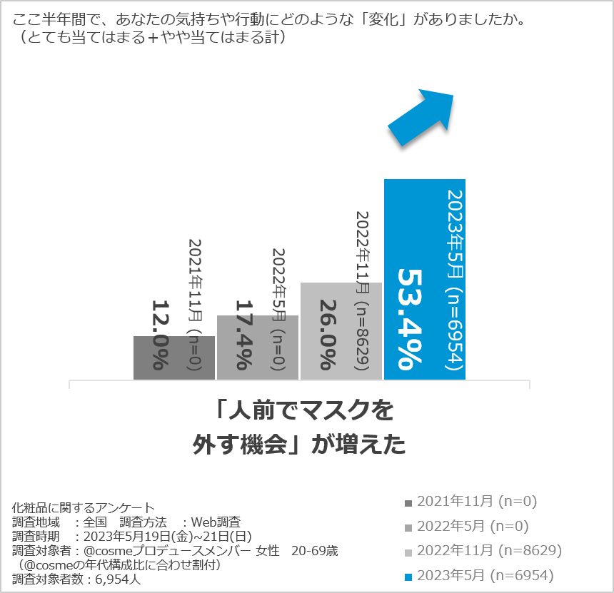 また「人前でマスクを外す機会」が増えたと回答した人は53.4%と半数以上を占め、前回調査の26.0%から倍増する結果となりました。今年3月にマスク着用が個人の判断となったことも後押しとなり、生活に大きな変化が起きているようです。