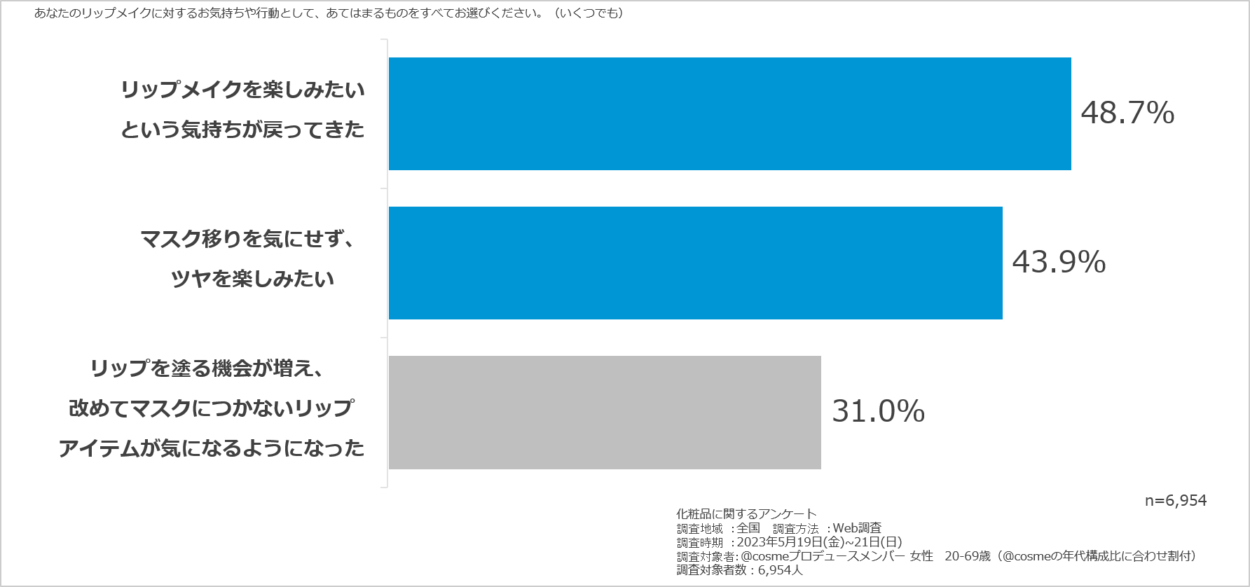 ユーザーアンケートでは、リップメイクに対する気持ちや行動にあてはまるものとして「リップメイクを楽しみたいという気持ちが戻ってきた」と回答した人が全体の約半数の48.7%に及びました。さらに、「マスク移りを気にせず、ツヤを楽しみたい」と回答した人も43.9%おり、「リップを塗る機会が増え、改めてマスクにつかないリップアイテムが気になるようになった」という回答を約13ポイント上回る結果になりました。