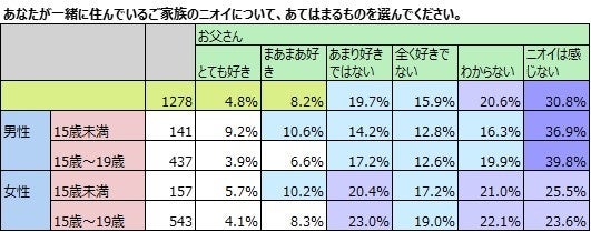 また、父親のニオイが気になるか否かを15歳未満と15歳以上に分けてみると、15歳未満の子どもの方が、男女ともに両親のニオイについて「気になる」と答えている割合が高いことがわかりました。また、母親のニオイに関しては、男の子は15歳未満の方が「気になる」と答えている割合が高いことがわかりました。