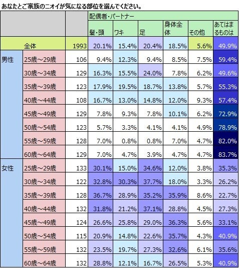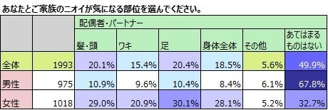 夫が気にしている部位よりも、妻が気にしている夫のニオイは「身体全体」。