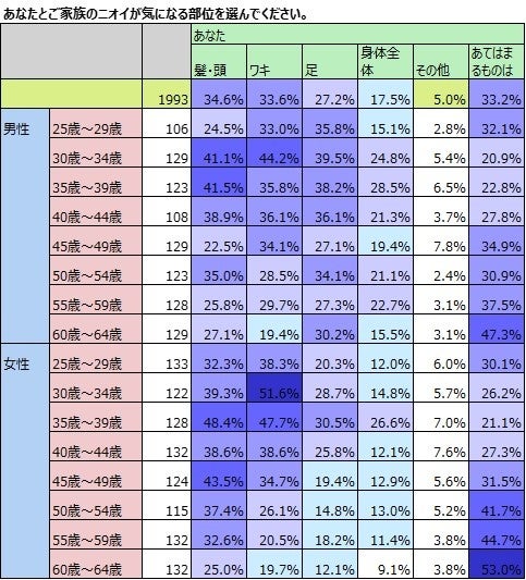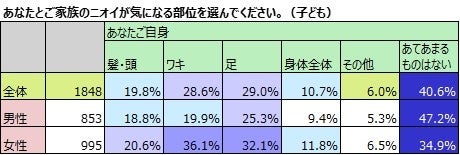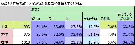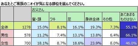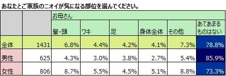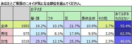 妻が気になるニオイ「自分」65.5%、「夫」67.3%、「子ども」51.4%。