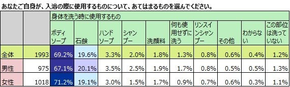 ボディソープで身体を洗うのは、男性も女性も約7割。