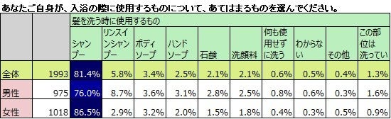 シャンプーで髪を洗うのは、男性8割未満 女性約9割。