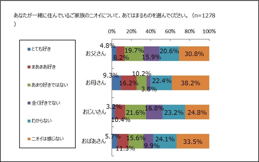 子どもに、同居する家族のニオイについて、好きか否か聞きました。「とても好き」と「まあまあ好き」を合わせると、パパのニオイが好きな子どもは13.0%で、ママのニオイが好きな子どもは、25.5%でした。尚、おじいちゃんのニオイが好きな子どもは13.6%でパパとほぼ同率です。おばあちゃんのニオイが好きなこどもは、17.0%でした。ただし、パパ、ママともに「ニオイは感じない」と答えた割合が最も多く、次に多いのが「わからない」という結果でした。別の見方をすると、パパのニオイが「あまり好きでない」19.7%と「全く好きでない」15.9%を合わせても35.6%であるため、嫌いな子どもの方が少数派であると言えます。