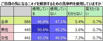自分の体のいずれかの部分のニオイが気になると答えた25歳~64歳の男女に、気になるニオイを解消するための洗浄料を使用しているか否か聞きました。男性は半数以上が使用していると答えており、女性は。43.1%です。