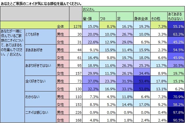 次に、パパのニオイが気になる部位と、ニオイが好きか否かを掛け合わせて男女別に見てみました。「身体全体」のニオイが気になると答えた子どもと、ニオイが「全く好きでない」と答えた子どもはリンクしていますが、気になると答えながら、パパのニオイが好きと答えている子どもは、「身体全体」で男の子で25.9%、女の子は24.5%とほぼ同じくらいの比率で「好き」だと答えています。そのため、ニオイが気になるからと言って、ニオイが嫌いであるとは言い切れないことがわかります。