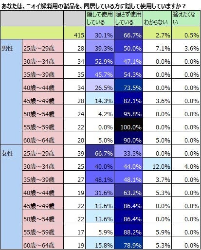 これを年齢性別で見てみると、男性も女性も若年層の方が使用している人が多く、年齢が上がるほど、使用率が下がります。また、ニオイを解消する製品を同居する家族に隠して使用しているか否か聞きました。こちらも男女ともに若年層であるほど、隠して使用している人が多い傾向が見られます。特に25歳~29歳の女性は、66.7%の人が隠して使用していることがわかりました。