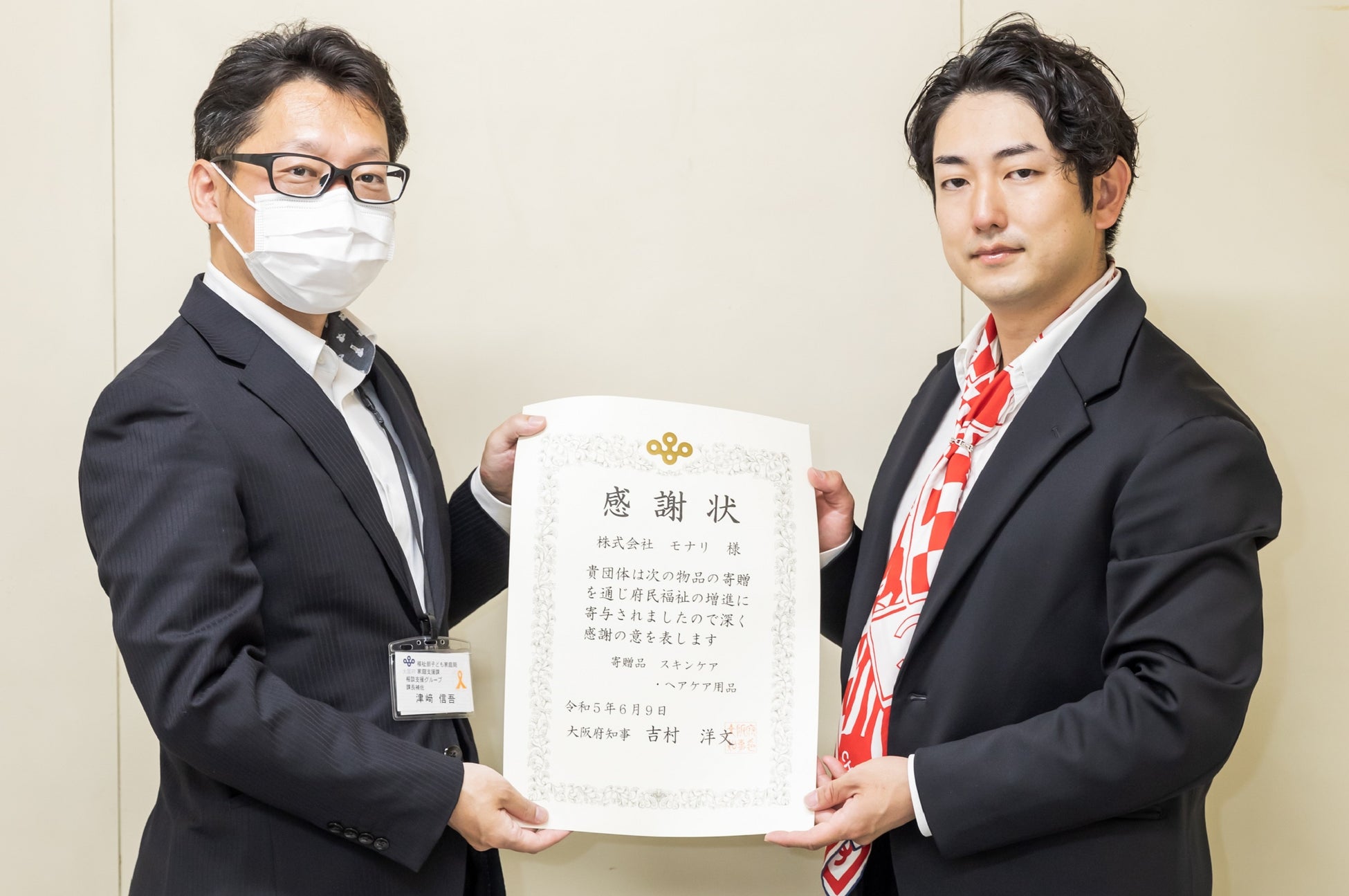 大阪府から感謝状を頂きました。(左:大阪府福祉部 津﨑課長補佐様、右:弊社代表 尾形麗)