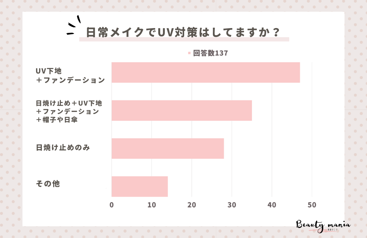 「日常メイクでUV対策はどのくらいしてますか?」とアンケート調査した結果、1位は『UV下地+ファンデーション(47人)』、2位は『日焼け止め+UV下地+ファンデーション+帽子や日傘(35人)』、3位は『日焼け止めのみ(28人)』となっています。