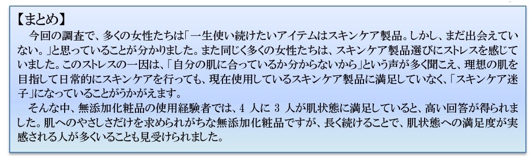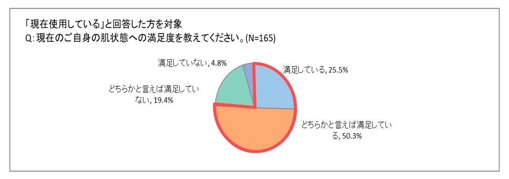 また現在、無添加化粧品を使用している人に肌状態の満足度について聞いたところ、「満足している」(25.5%)、「どちらかと言えば満足している」(50.3%)と、4人に3人が肌状態に満足しているようです。