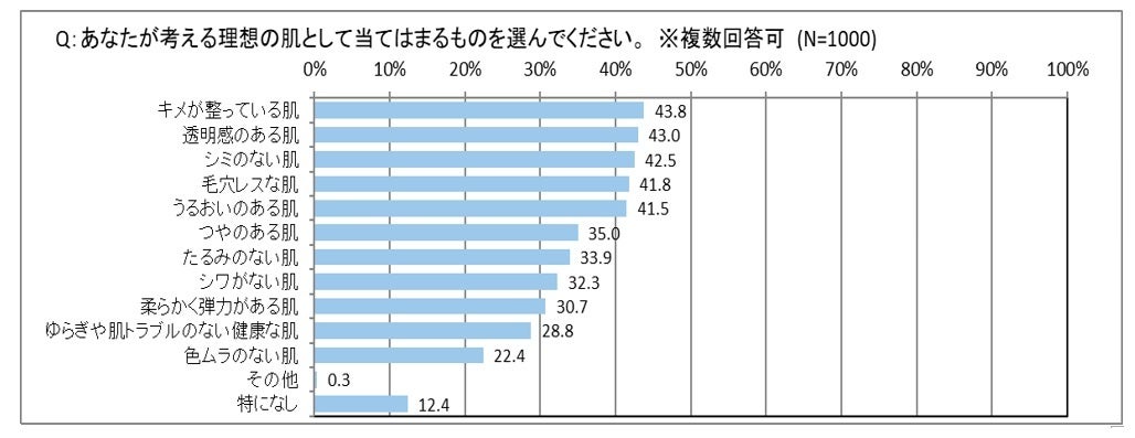 理想の肌について、最も多かったのは「キメが整っている肌」(43.8%)ですが、「透明感」「シミがない」「毛穴レス」「うるおい」とほぼ僅差でした。基本の「保湿」ケアに加えて、昨今のスキンケアのトレンドである「ブライトニングケア」や「毛穴ケア」への関心の高さを反映していると考えられます。