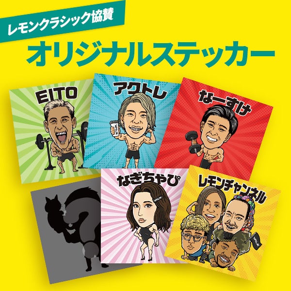 コラボを記念して、オリジナルステッカーとのセット販売を開始。プロテイン1袋購入ごとに、ランダムで1枚ステッカーが付きます。売上の一部は今夏2度目の開催となるレモンチャンネル主催のボディビルコンテスト「レモンクラシック」への協賛金として提供いたします。