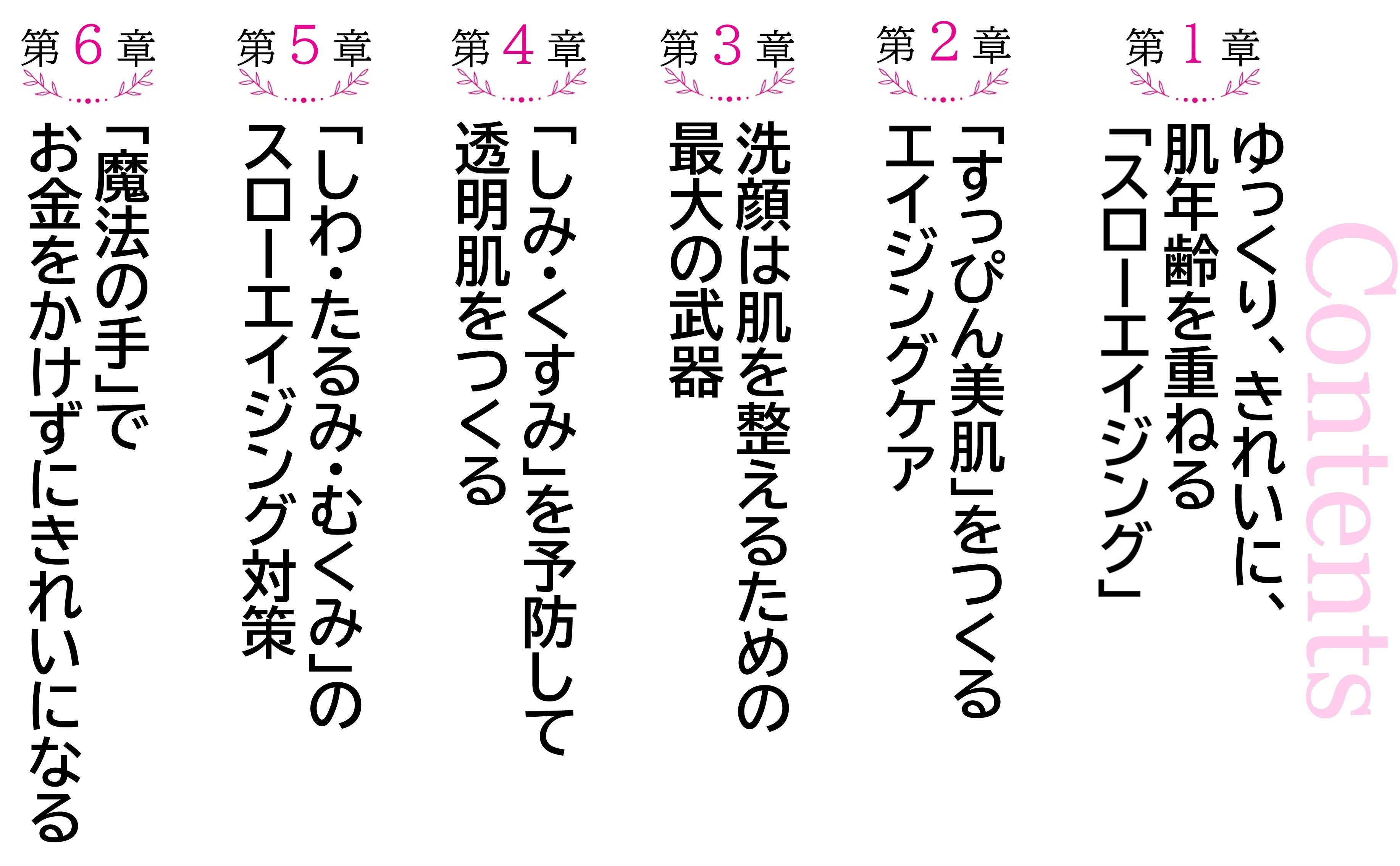 本書では、肌が変わり始めたと感じる女性をターゲットに、ゆっくり年齢を重ねる「スローエイジング」スキンケアを提案。サロンオーナーの知識と技術を盛り込み、肌トラブルのないすっぴん美肌を約束する1冊です。
