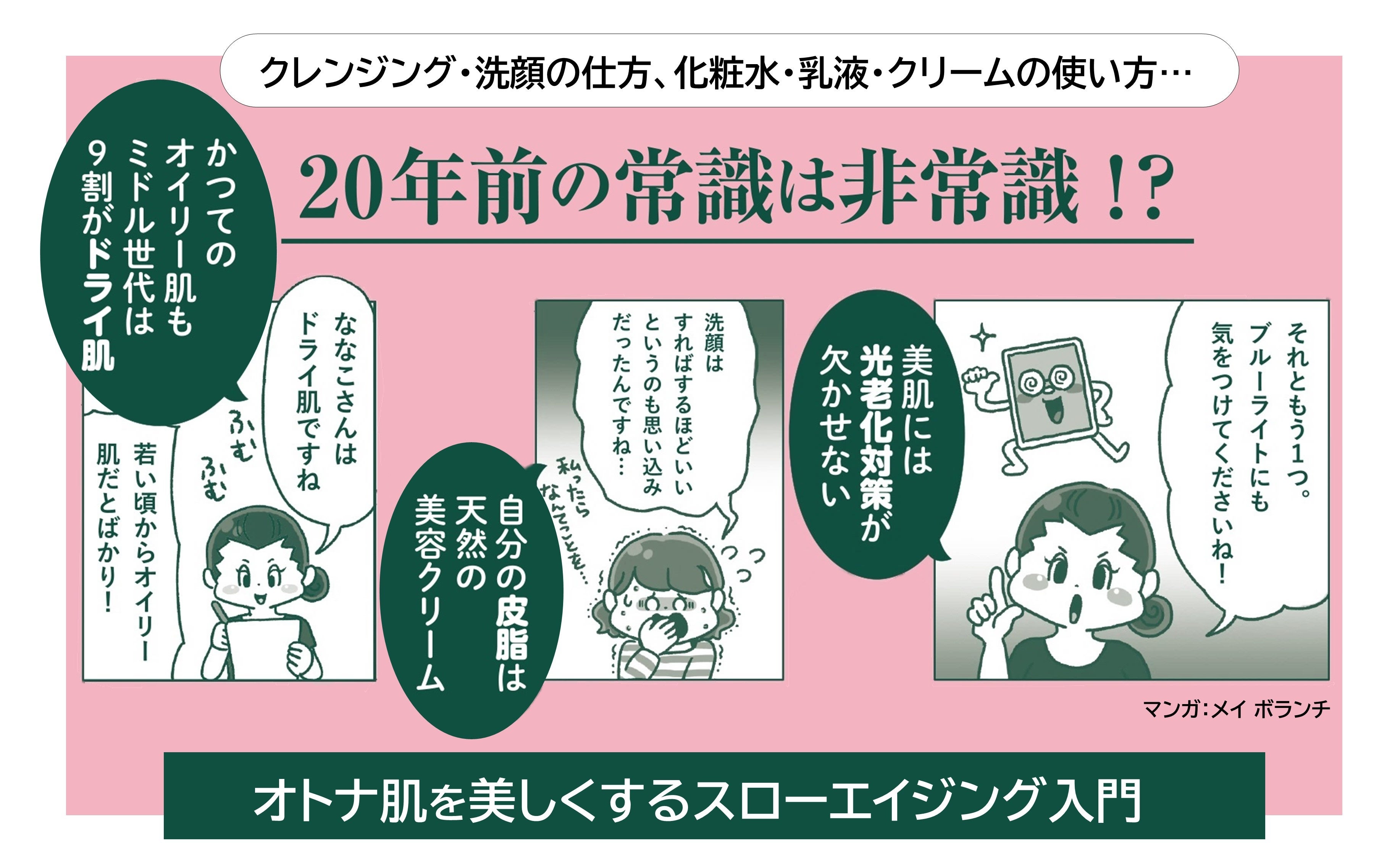 ミドル世代になると肌質が変わってくる女性は多いものです。しかし いつまでも同じ方法でケアしていたり、今となってはやってはいけないスキンケアをしていたりして、正しいスキンケアができていない人も多いのが現実。