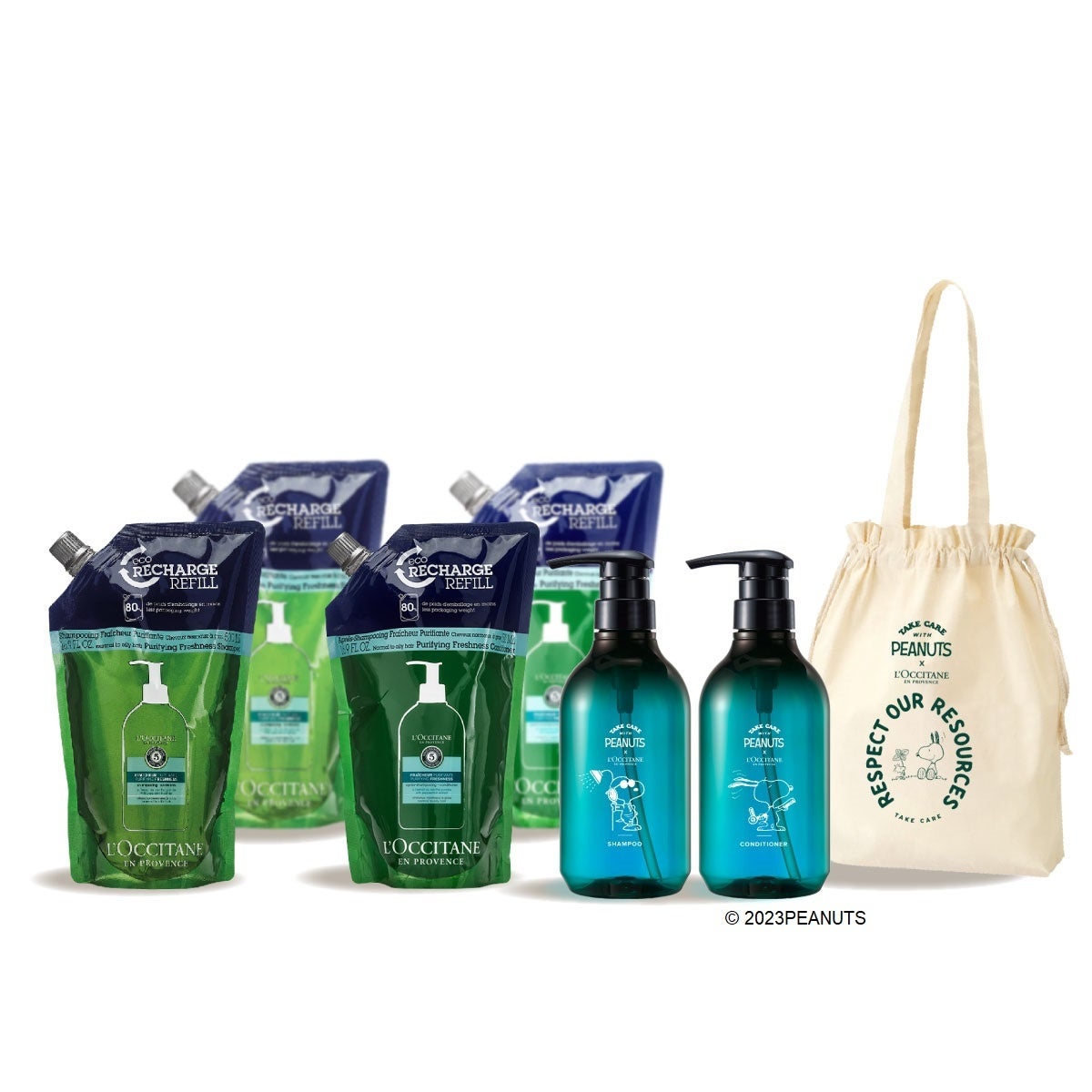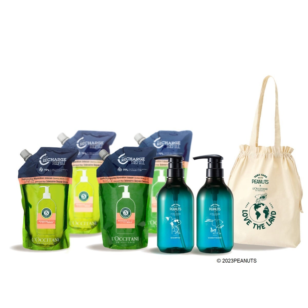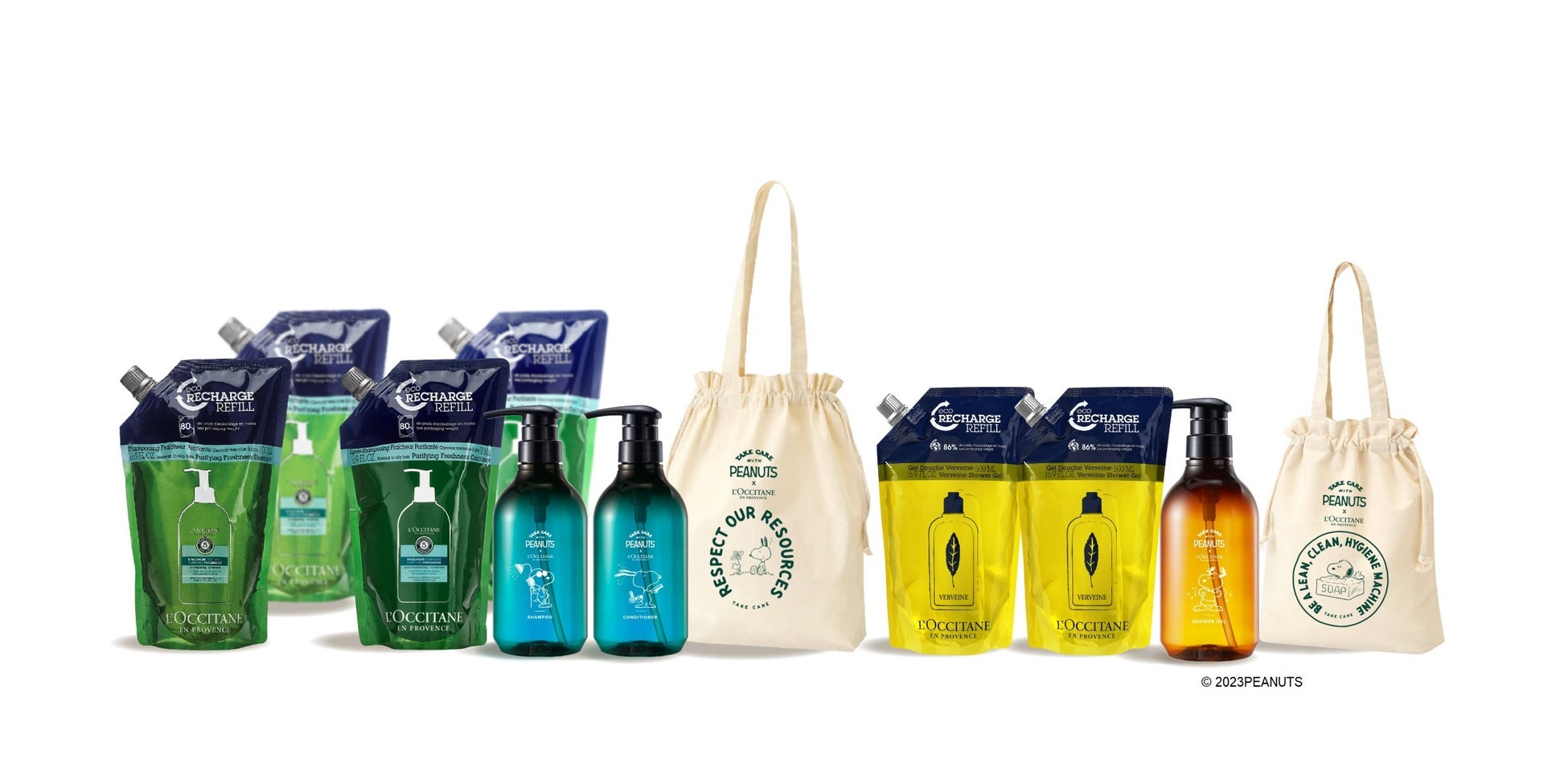 「Take care of the Earth」がテーマとなるコラボ第4弾は、ロクシタンの人気ヘアケアやシャワージェルのレフィルに、スヌーピーデザインのレフィルボトルと、今回は初めてリユーサブルバッグも付いてくる、この夏だけの特別な限定キットが新登場します。