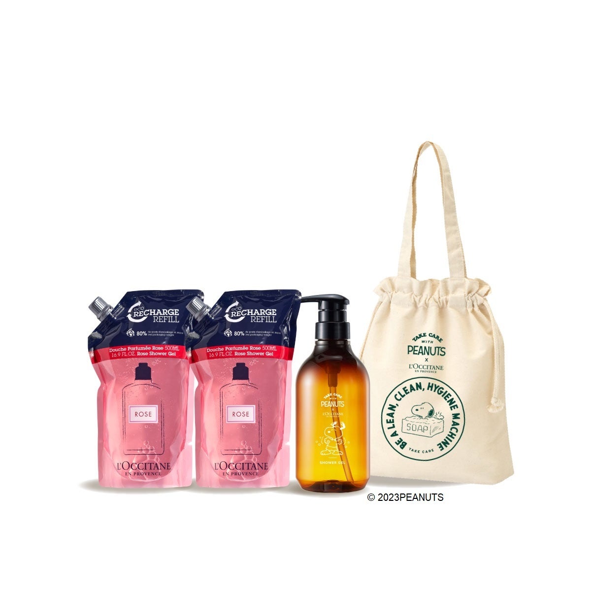 加えて、シャワージェルのレフィルキットも登場!香りは、レモンを思わせる爽やかな香り「ヴァーベナ」と、フレッシュで華やかな香り「ローズ」の2種から選べます。ヘアケア同様に、レフィルはスヌーピーデザインのリユーサブルバッグに入れてお届け。さらに身体を洗うかわいいスヌーピーが描かれたシャワージェル用ボトルがついてきます。