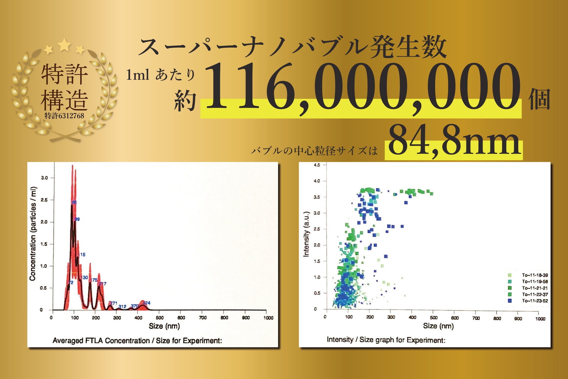 ▶特許構造のスーパーナノバブルコアで、1mlあたり1億1,600万個、84.8nm(ナノメートル)の超極小スーパーナノバブルの泡を発生させ、1分間に約1,200回~1,400回の強力ジェット水流で、今までにない新しい口腔洗浄器 ジェットウォッシャー、「 スーパーナノバブルフロッサー Nrich (エンリッチ) 」を開発いたしました。
