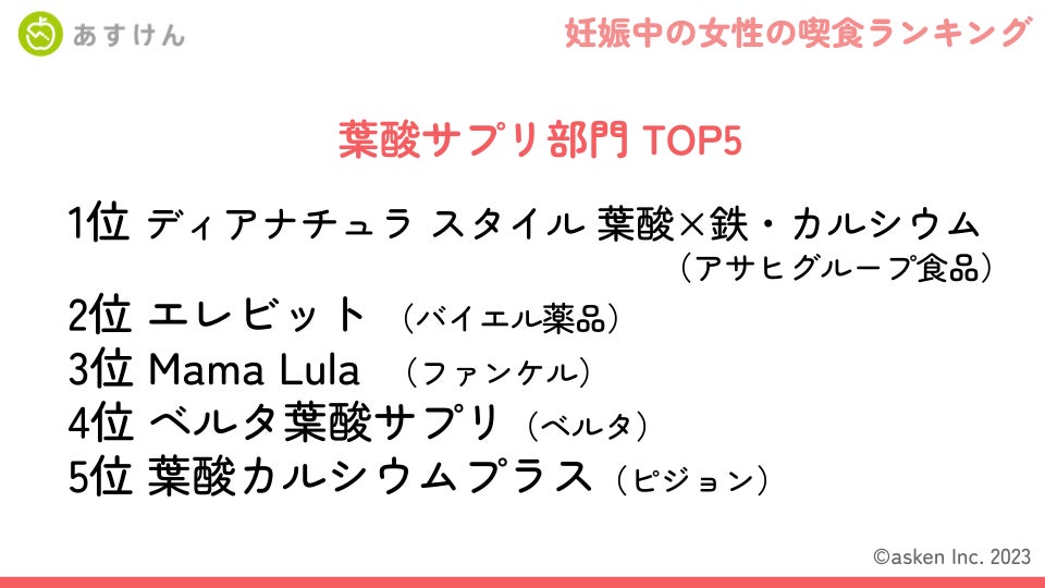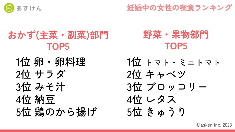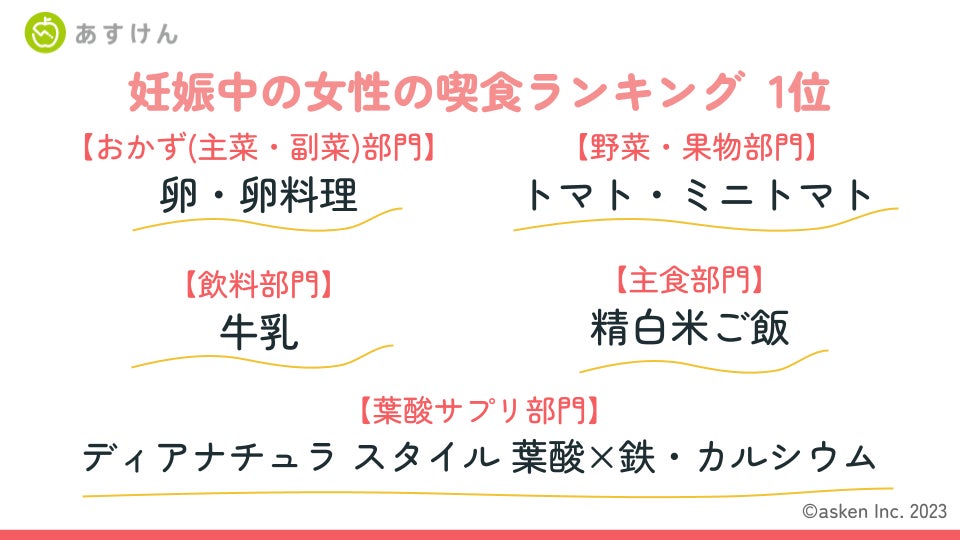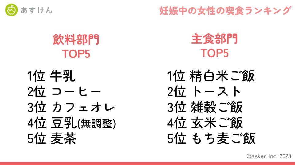 会員数800万人超*¹、国内No.1*² AI食事管理アプリ『あすけん』を開発・運営する株式会社asken(東京都新宿区、代表取締役社長 中島洋)は、『あすけん』のアドバイスコース「妊娠・授乳期に!あすママコース」(以下、あすママコース)のリリースから1年が経過し、のべ利用者数が28,486人となったことを機に、当コースを利用するユーザーの食事記録データを集計した「妊娠中の女性の喫食ランキング」を発表いたします。