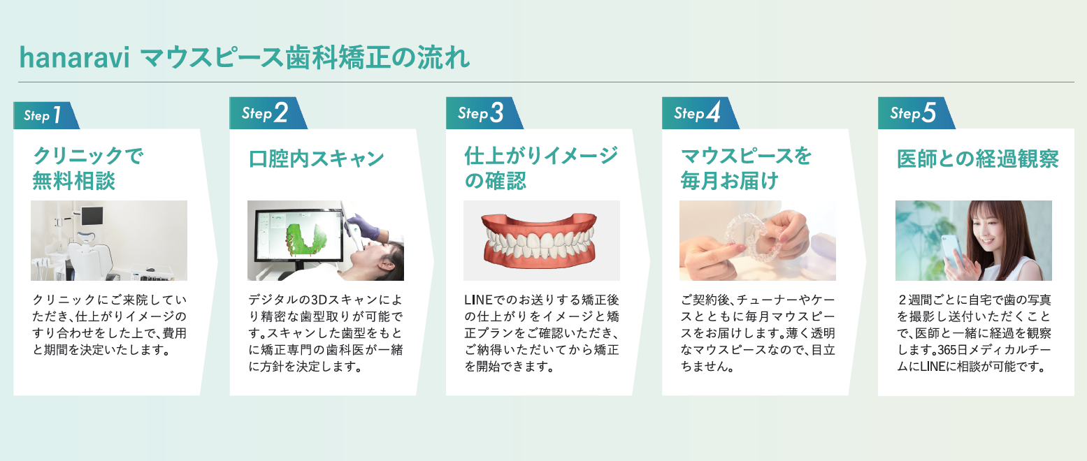 その第一歩として将来の健康リスクの予防に則して口腔ケアにつなげられ、かつ従来100万円前後と高価であった歯科矯正をリーズナブルに行うことができる「hanaravi(ハナラビ)」を、信頼できる提携歯科医と共に提供しています。