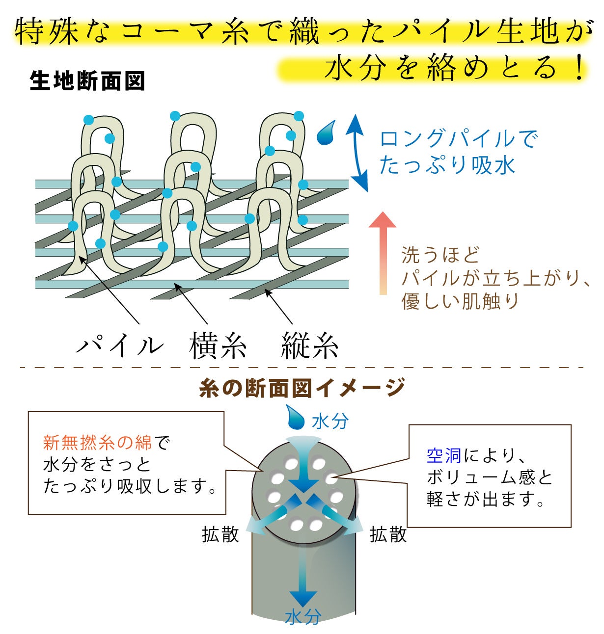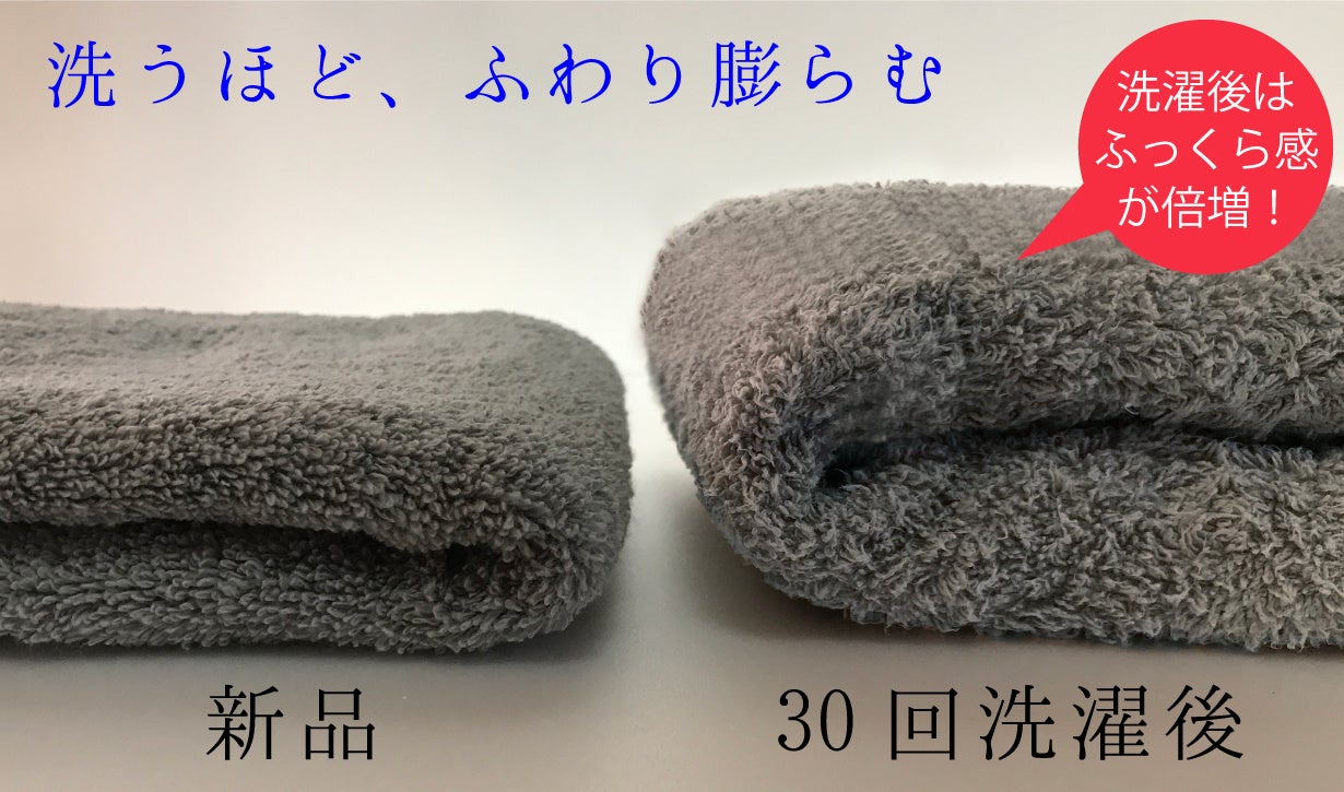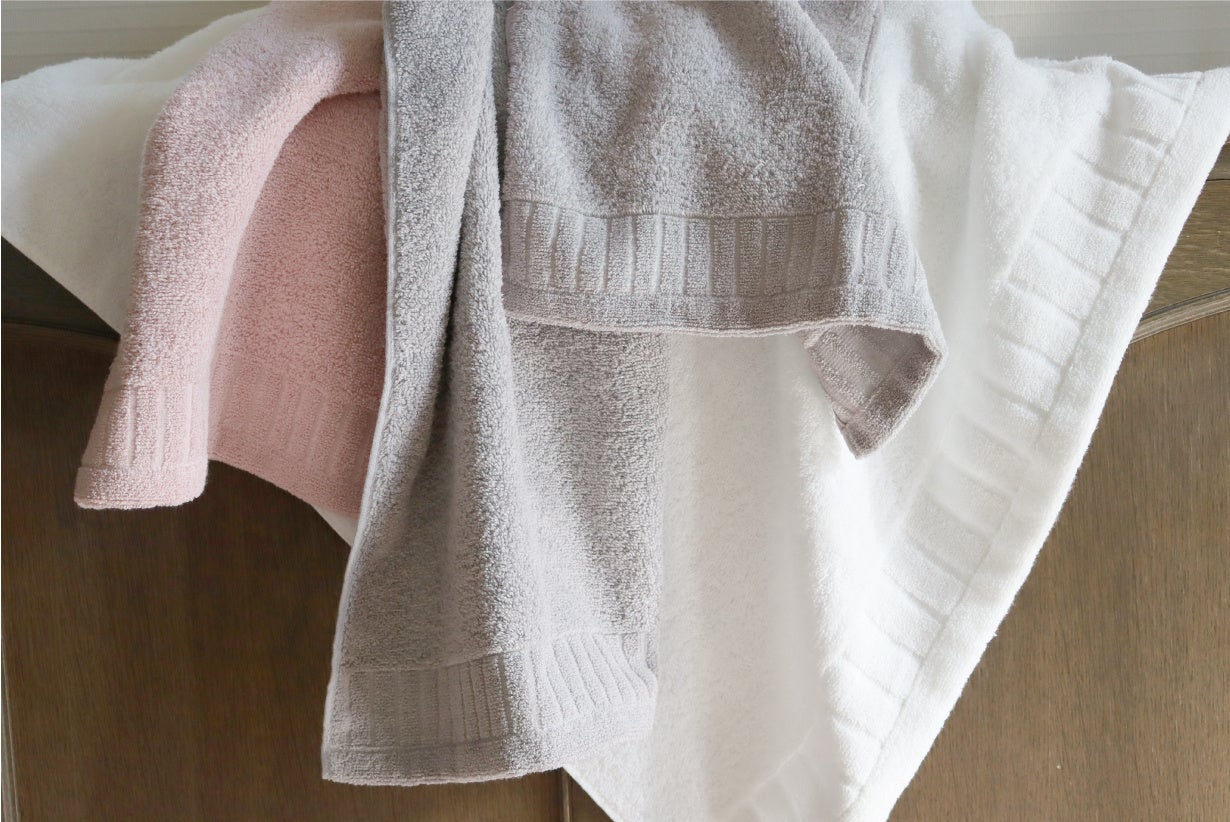 厳選された高級コットンに特殊な加工技術を施しているため、空気をたっぷり含んでいるので柔らかく、ふんわりとしたボリュームがあり、吸水性も抜群です。毎日のタオルを使う時間を至福のひと時へ。