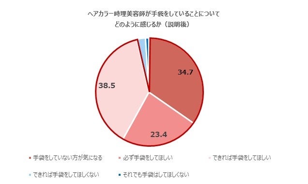 ・ヘアカラー時、理美容師が手袋をしている事について気にならない方が多く、全ての世代で74.8%以上、全世代平均では82.6%を占めている。気になる方の理由でも「理美容師自身の手を守ることができて良い」が上位。