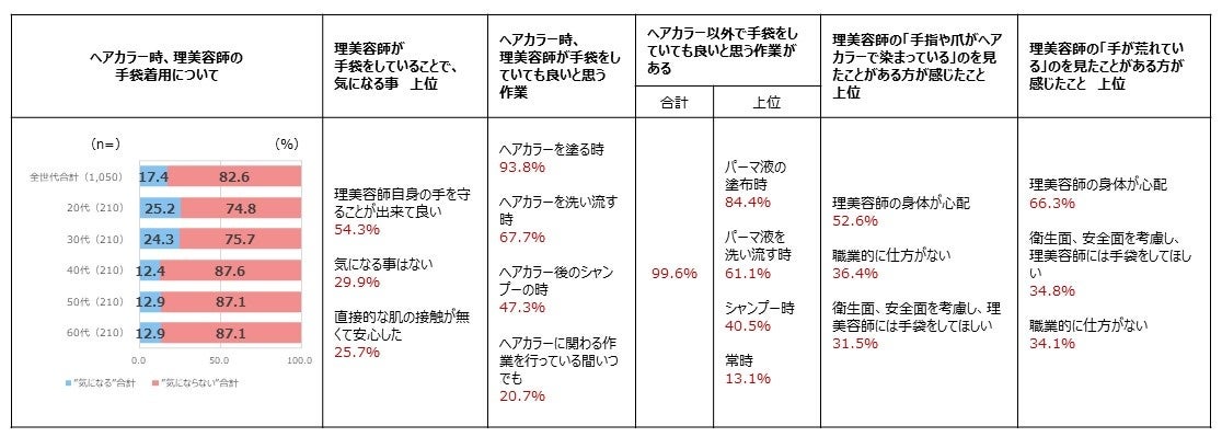 ・ヘアカラー時、理美容師が手袋をしている事について気にならない方が多く、全ての世代で74.8%以上、全世代平均では82.6%を占めている。気になる方の理由でも「理美容師自身の手を守ることができて良い」が上位。